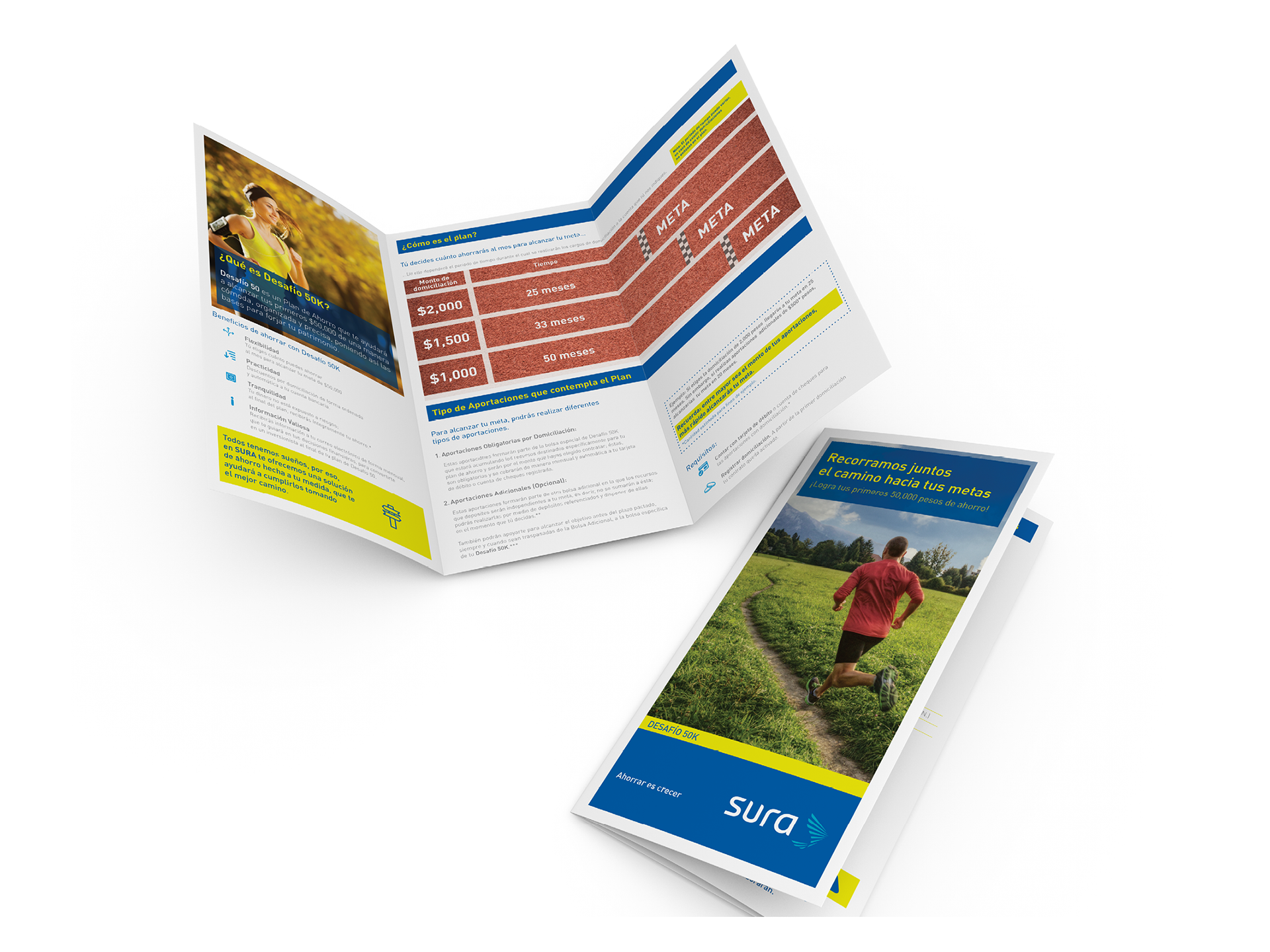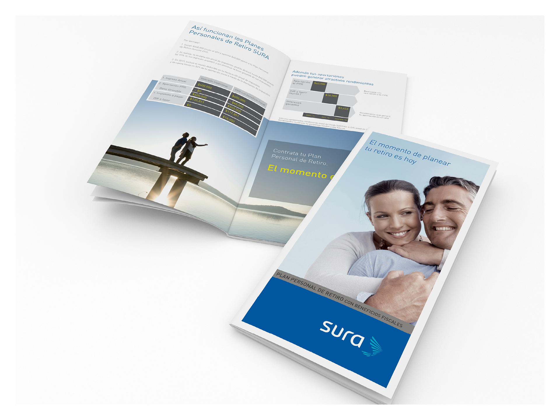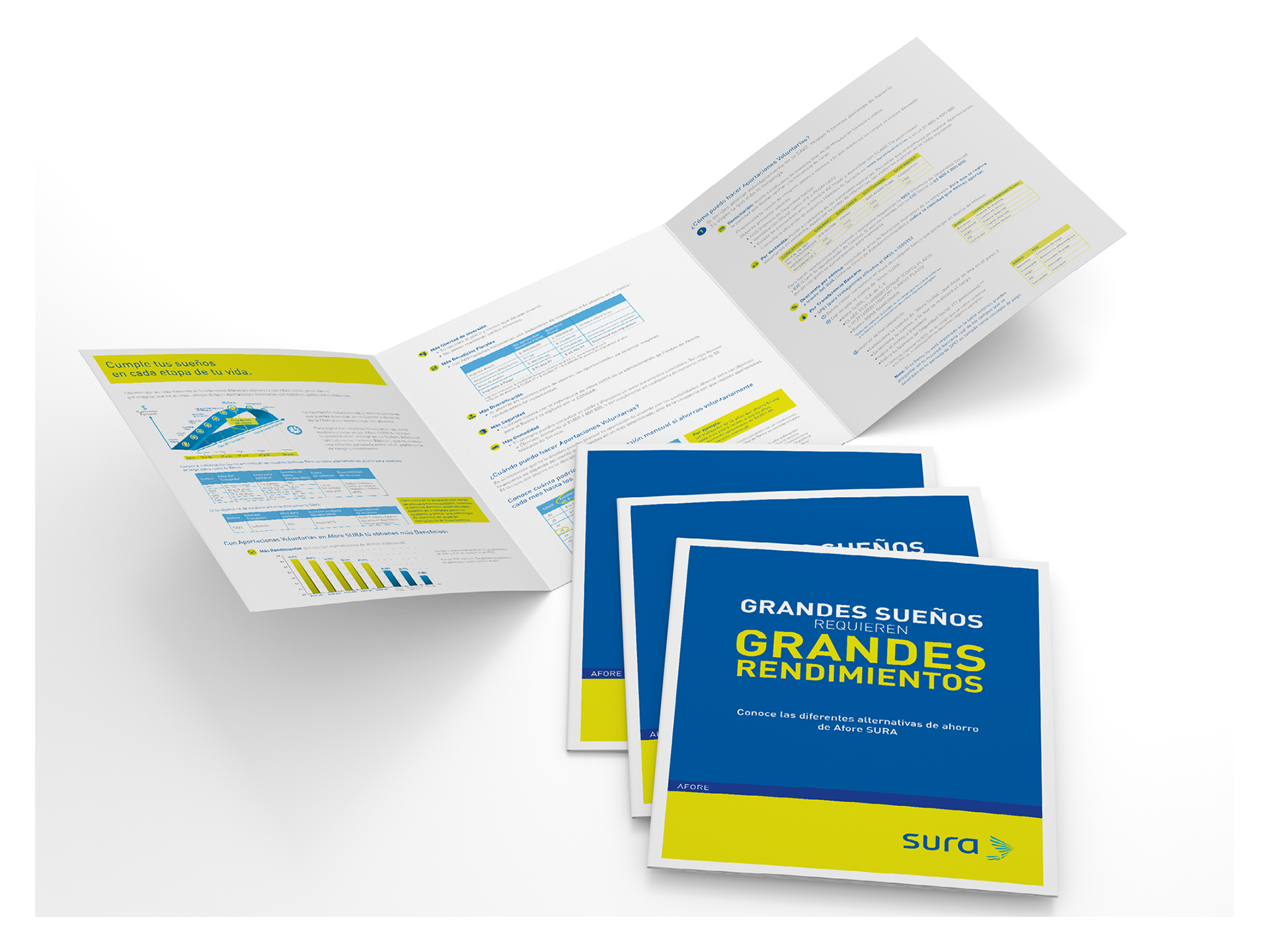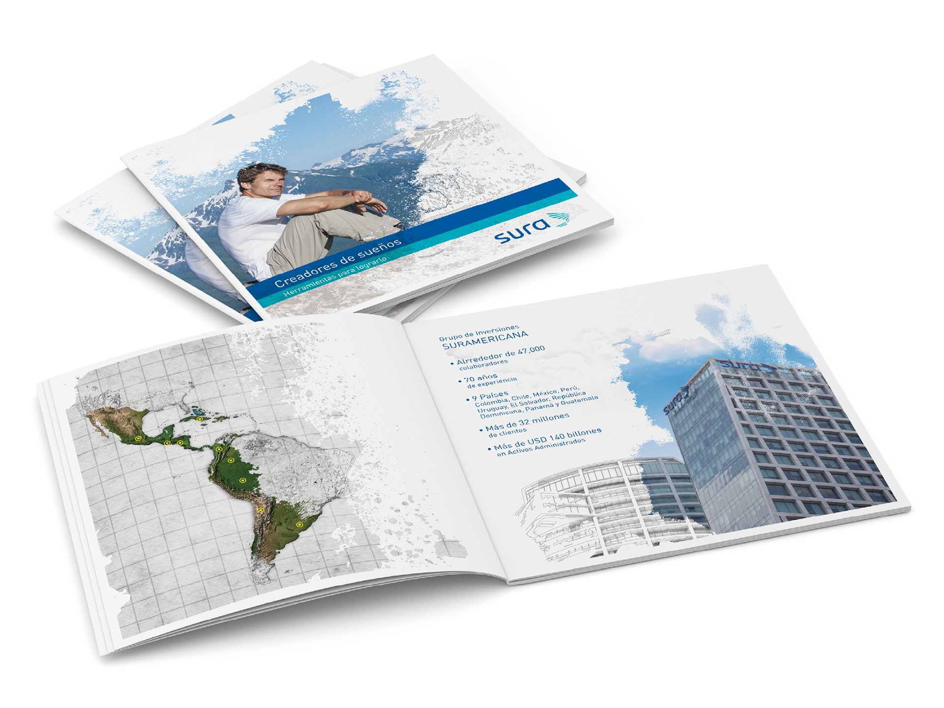 Diseño de folletos para compañía de seguros (SURA). En todos los casos se propuso el formato así como los lineamientos para portadas, imágenes y diagramación de interiores.